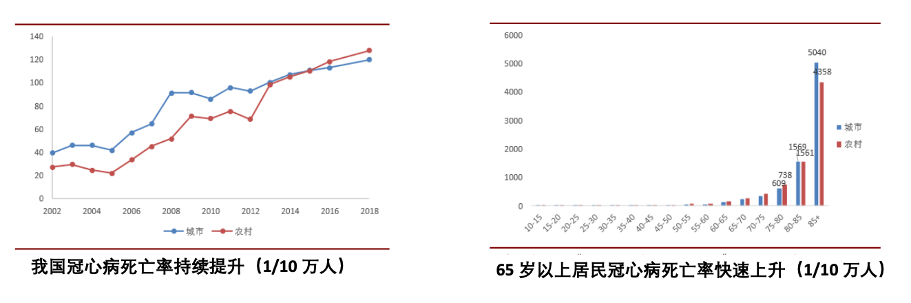 冠心病患病率及死亡率持续上升, 老龄化加速这一趋势。据《中国 心血管病报告2018》统计,目前 我国心血管病患人数为 2.9 亿, 死亡率居首位,高于肿瘤及其他疾病,占居民疾病死亡构成的 40%以上