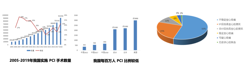 2018 年我国 PCI 手术 91.53 万例,同比增长 22%, 预期未来仍将保持 17%以上的增势。但我国人口基数庞 大,渗透率稍显不足, 2016 年仅为 37%,远低于同期 欧美 85%以上的水准,目前每百万人 PCI 仅 为 656 例, 远低于欧美日 2000 以上的水平,尚存较大的发展空间。 2017 年接受 PCI 治疗患者不稳定性心绞痛和 STEMI 占绝大多数。