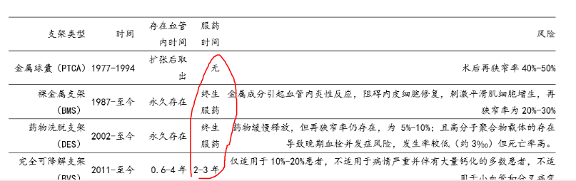 ⚫ 第一代 DES 为永久聚合物涂层,术后需使用抗凝药物 1 年以上,